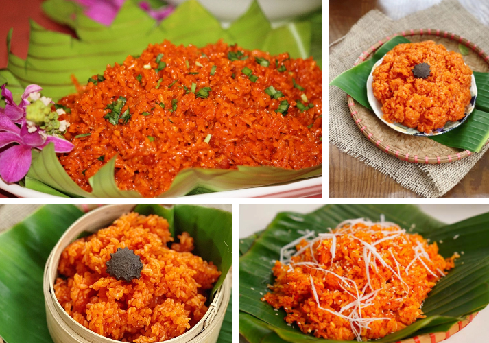 Xôi gấc thành phẩm lên màu đẹp, hạt nếp dẻo thơm ngậy. Màu cam đỏ của xôi gấc hấp dẫn sẽ giúp tô điểm cho mâm cỗ Tết của gia đình bạn thêm sắc màu. Ngoài ra, chị em có thể dùng khuôn tùy loại để tạo hình cho thêm đẹp, chẳng hạn cá chép vàng cúng ngày ông Công ông Táo, khuôn hình trái tim, hình hoa cúc,...