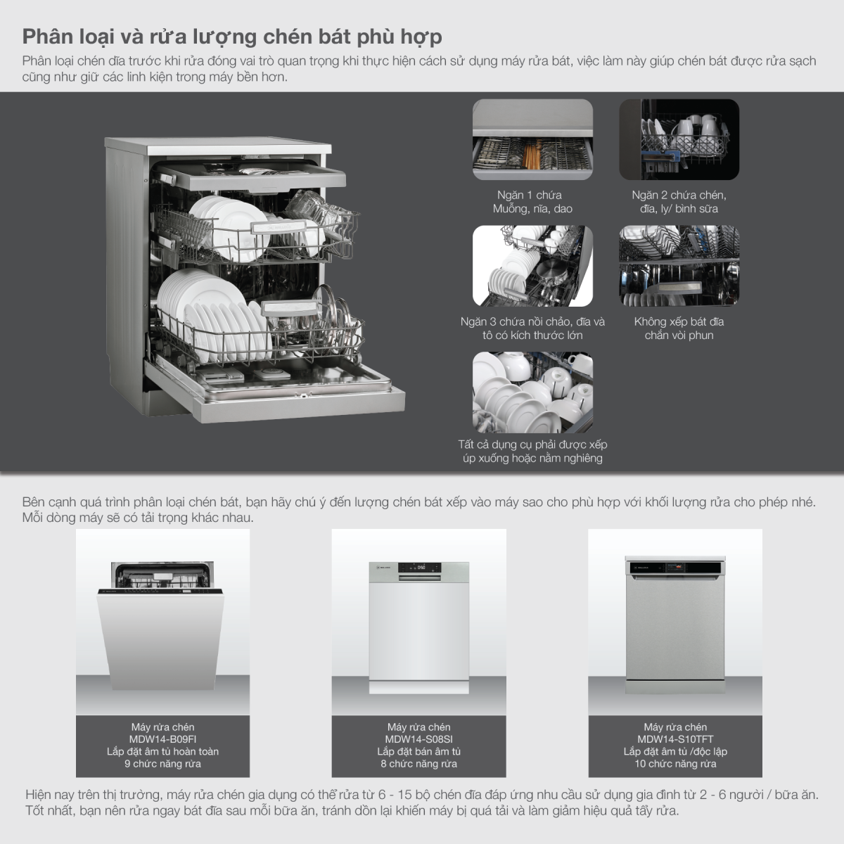 Bên cạnh quá trình phân loại chén bát, bạn hãy chú ý đến lượng chén bát xếp vào máy sao cho phù hợp với khối lượng rửa cho phép nhé. Mỗi dòng máy sẽ có tải trọng khác nhau. Tốt nhất, bạn nên rửa ngay bát đĩa sau mỗi bữa ăn, tránh dồn lại khiến máy bị quá tải và làm giảm hiệu quả tẩy rửa.