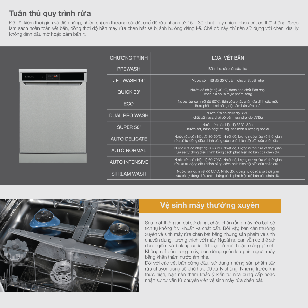 Nhằm tăng khả năng làm sạch cũng như kéo dài tuổi thọ của máy lên đến hàng chục năm, các chuyên gia đều khuyên rằng người dùng nên chọn những sản phẩm làm sạch tương thích với máy rửa bát. Chất rửa ngoài công dụng rửa sạch chén bát, sản phẩm cần có khả năng bảo vệ thiết bị khỏi những sự cố thường gặp.