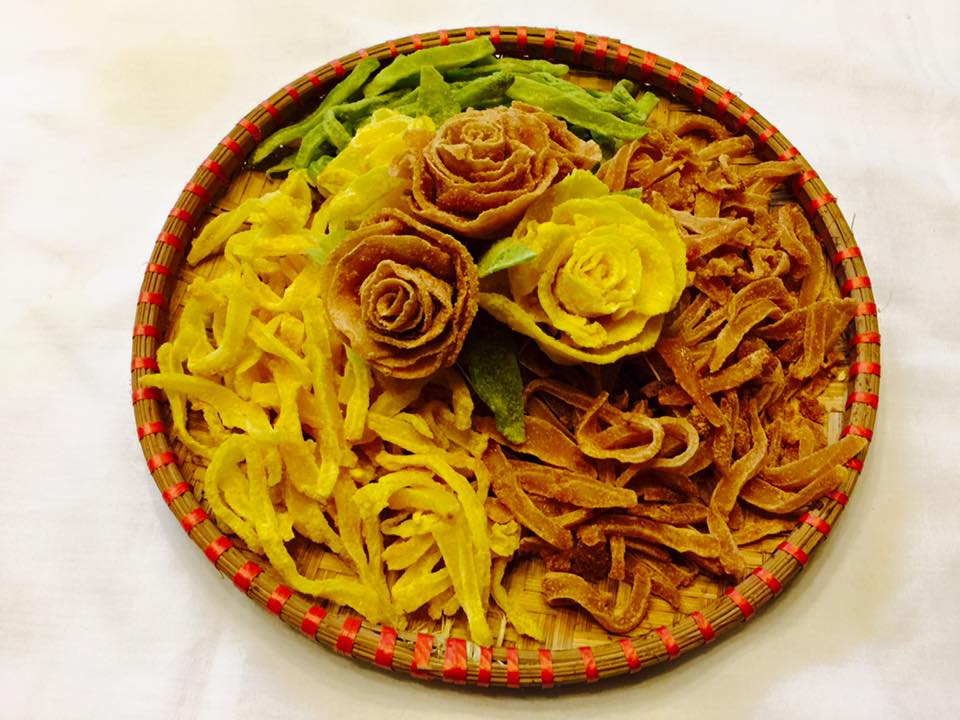 Món mứt có tạo hình đẹp mắt bên cạnh những hình dáng quen thuộc. Mứt khoai tây muốn làm thì cần có khoảng 1kg khoai tây củ vừa, không to hay nhỏ quá. Bạn sẽ cần dùng từ 400 – 450 gr đường cho số lượng khoai tây này. Với tạo hình hoa hồng thì bạn cần bào mỏng khoai rồi rim cùng đường. Tạo hình hoa hồng cho miếng khoai khi miếng khoai bắt đầu có kết tinh đường. Nếu muốn tạo màu cho món mứt bạn có thể dùng thêm màu thực phẩm để chế biến.