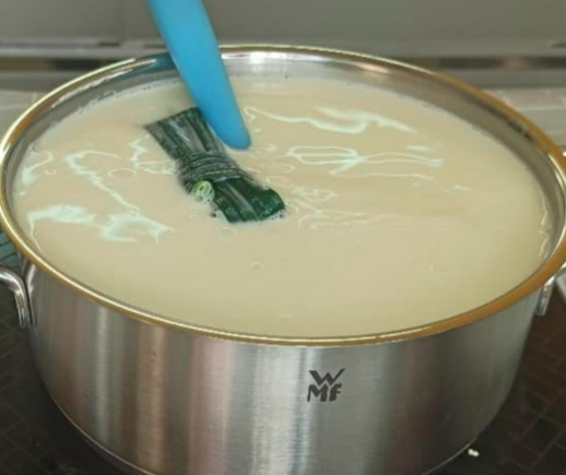 Thêm lá dứa vào phần sữa đậu đun sôi.