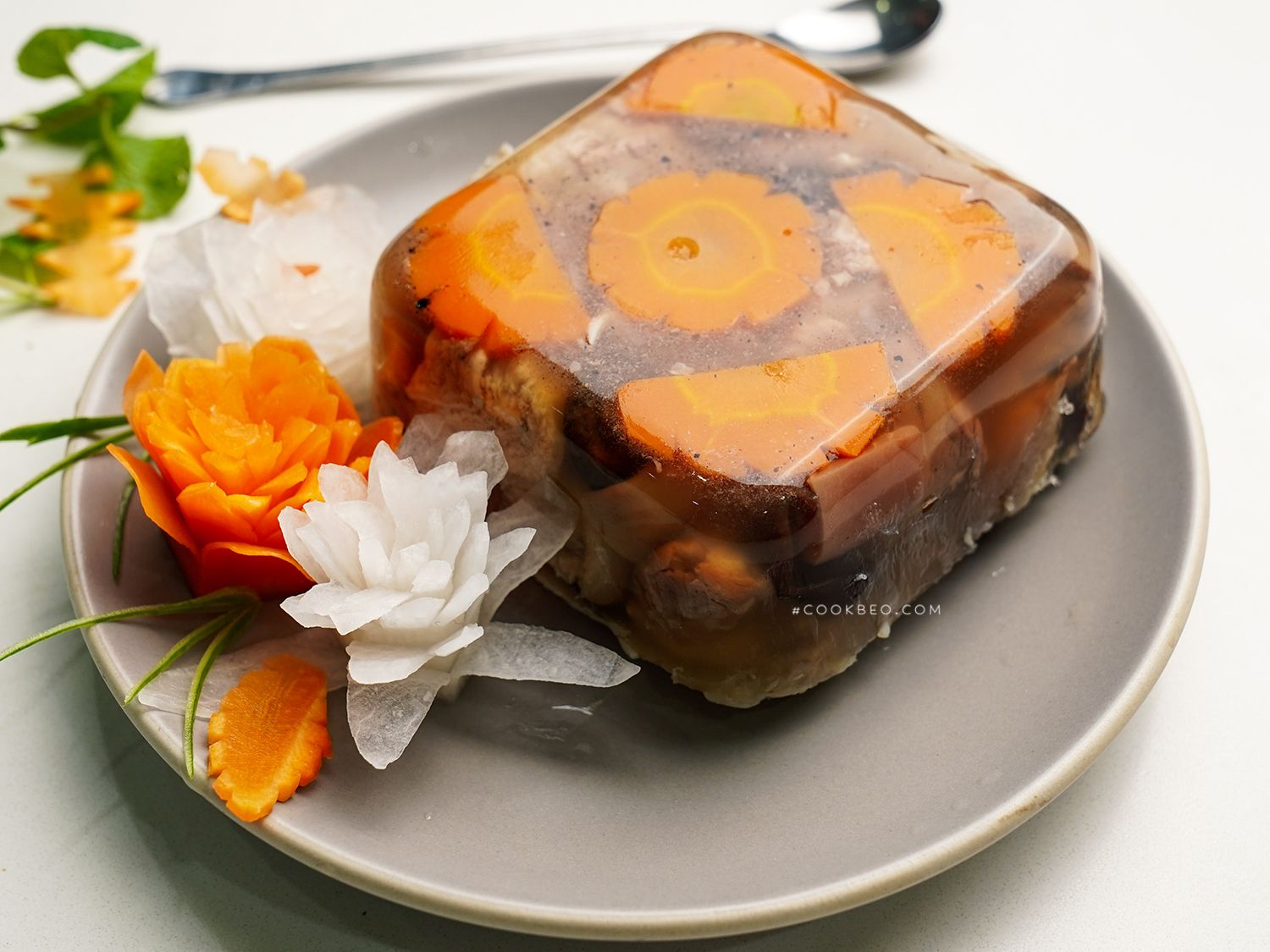 - Cắt tỉa hoa cà rốt cho vào các bát vừa ăn, xếp hoa xuống dưới đáy lần lượt cho thịt đông lên trên.