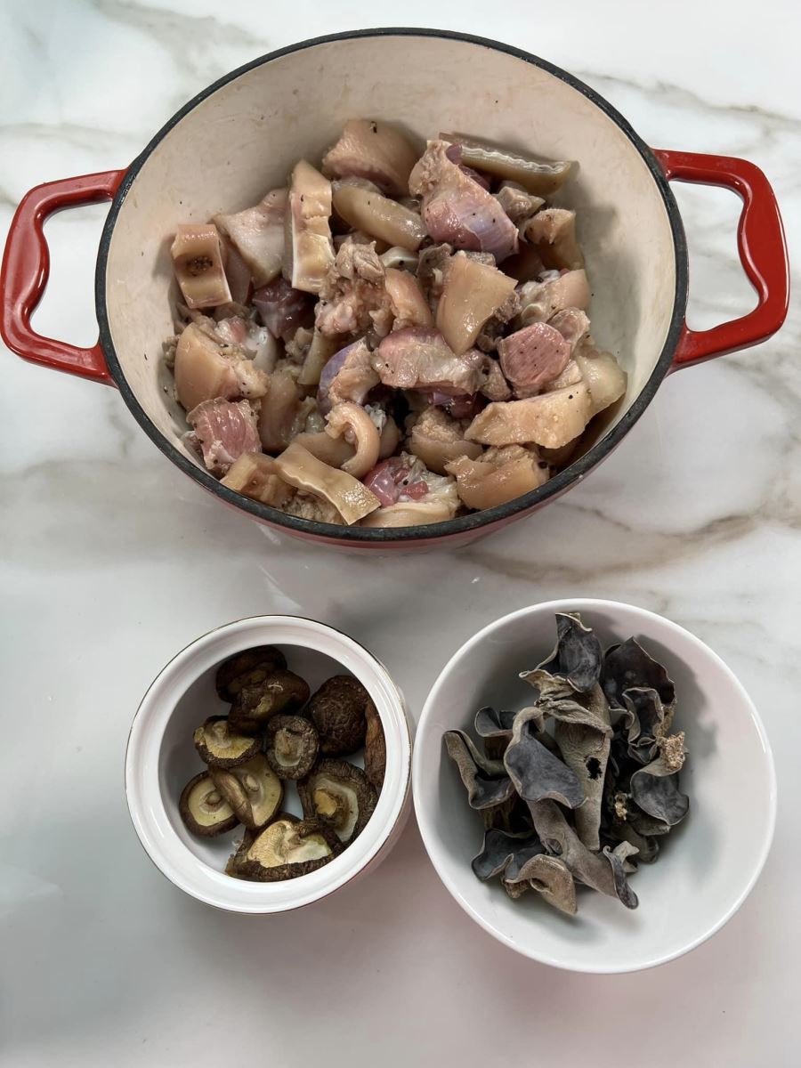 - Mộc nhĩ rửa sạch ngâm nở, nấm hương rửa sạch ngâm cùng 100ml nước nóng (giữ lại nước ngâm).