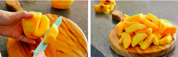 Bước 1: Rửa sạch đào rồi gọt vỏ thật mỏng. Tiếp đến, cắt thành từng miếng vừa ăn.