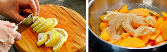 Bước 2: Cắt chanh thành những lát mỏng. Sau đó, cho đào, chanh và đường vào nồi. Đối với các bạn không có sở thích ăn ngọt thì có thể cho thêm một chút nước cốt chanh.