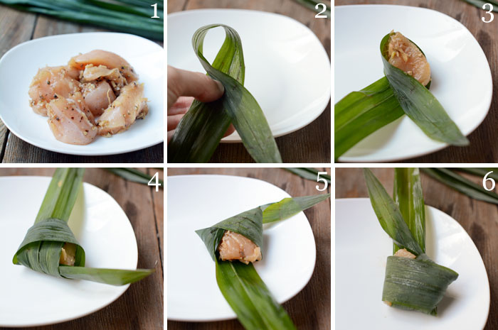 Cách cuộn miếng thịt gà vào lá dứa theo các bước