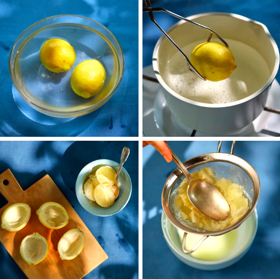 Bước 1: Rửa chanh dưới vòi nước sau đó dùng baking soda chà xát lên lớp vỏ để làm sạch và loại bỏ bớt tinh dầu. Sau đó cho chanh vào ngâm trong nước khoảng 10 phút. Đặt một nồi nước lên bếp đun sôi. Cho chanh vào nước sôi và chần trong 15 giây để khử trùng. Cắt chanh làm đôi theo chiều dọc. Khéo léo dùng thìa tách lấy riêng phần ruột, giữ nguyên phần vỏ để dùng sau. Cho ruột chanh vào một bát và dùng thìa ấn mạnh để tách nước cốt. Lọc chanh đã dầm qua rây để lấy phần nước cốt.