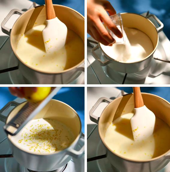 Bước 2: Cho kem tươi, đường và vỏ chanh bào vào nồi rồi đun trên lửa nhỏ, khuấy đều trong khoảng 3 phút. Nếu không thích bạn có thể bỏ qua nguyên liệu vỏ chanh bào.