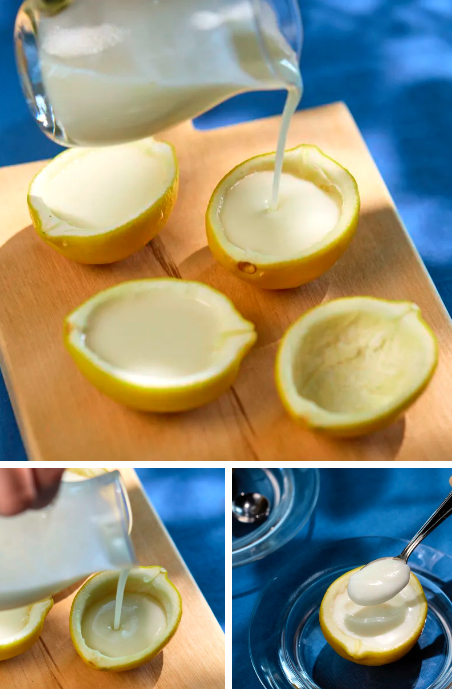 Bước 5: Cho phần kem vào vỏ quả chanh rỗng hoặc lọ thủy tinh nhỏ (Lưu ý: bạn phải khử trùng lọ thủy tinh bằng nước nóng và để ráo trước khi cho kem tươi vào) và làm lạnh trong tủ lạnh ít nhất 2 giờ. Quan sát thấy phần kem tươi đã đông sánh thì lấy ra thưởng thức.
