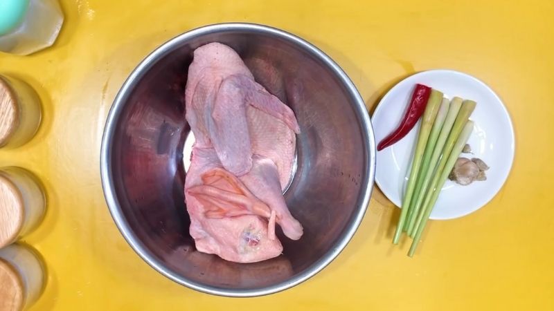 Vịt rửa sạch, khử mùi bằng rượu trắng, gừng đập dập và muối hột.
