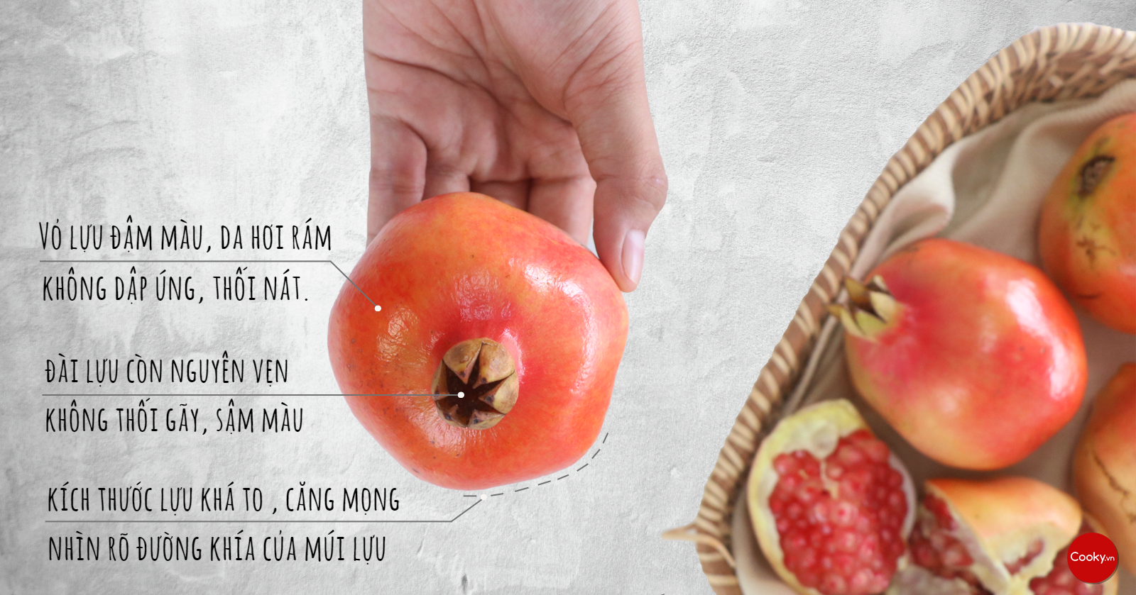 Với những quả lựu còn tươi ngon, chín sẽ có phần vỏ săn chắc, căng mọng khi ấn thử vào. Nếu những quả dùng tay ấn vào thấy mềm chúng tỏ bên trong có thể quả đã bị hỏng. Sau đó kiểm tra xem vỏ có vết xước không, nếu quả lựu có vỏ mịn thì quả lựu còn tươi, nếu da của quả lựu thô ráp, không mịn màng, thậm chí còn có các đốm đen. chứng tỏ nó đã được hái từ lâu.