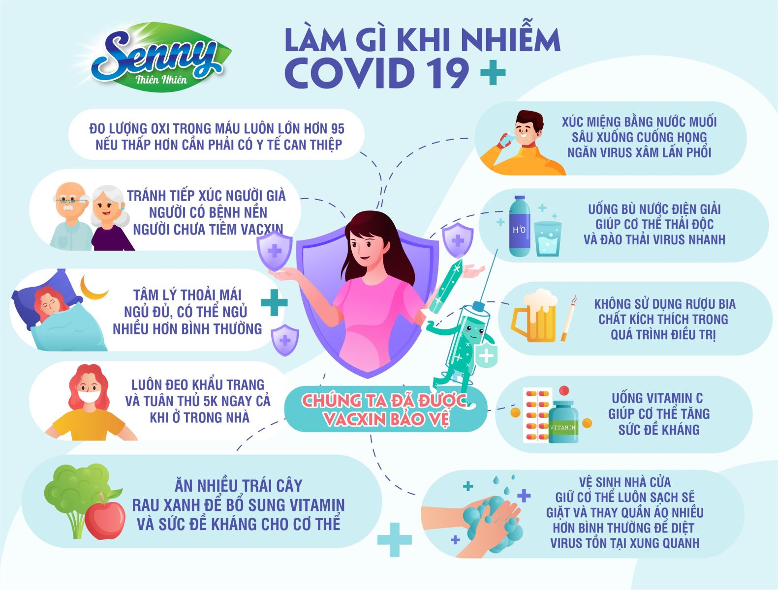 Hiện nay, mới chỉ có vắc-xin phòng bệnh, chưa có thuốc điều trị đặc hiệu Covid-19 và chủ yếu vẫn dựa vào việc nâng cao sức đề kháng của cơ thể, tạo môi trường sống trong lành, thoáng khí để từng bước loại trừ dần vi-rút ra khỏi cơ thể và điều trị các triệu chứng, biến chứng (nếu có). Vì vậy, mỗi người bệnh khi bị nhiễm vi-rút SARS-CoV-2 hãy tự thực hiện một số biện pháp sau: