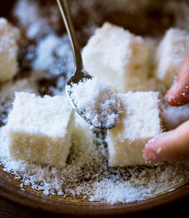 Cắt bánh thành từng hình quân cờ, lăn qua dừa khô