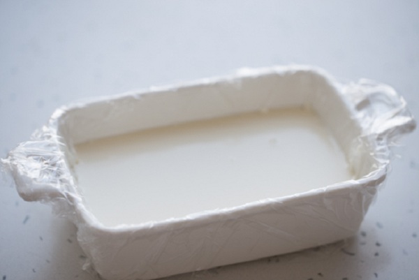 Bước 4: Lấy hộp đựng hình vuông hoặc chữ nhật để làm khuôn bánh, lót một lớp màng bọc thực phẩm cho bánh khỏi dính khuôn.