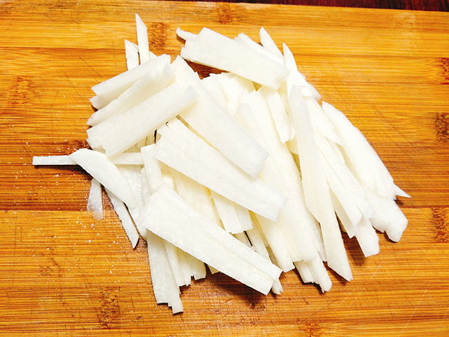 Củ đậu thái con chì, ngâm nước lạnh để có độ giòn và ngọt