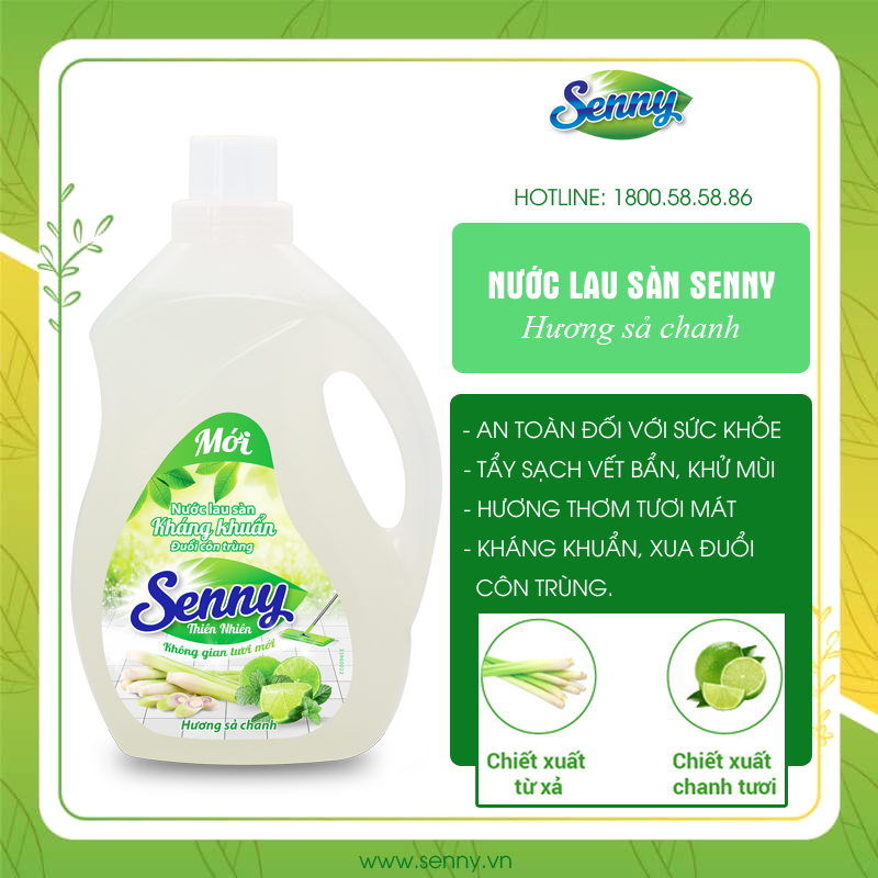 Nếu bạn đang lo lắng khi sàn nhà mình dù đã lau chùi thường xuyên mà vẫn không sạch. Vết bẩn, côn trùng, mùi ẩm mốc vẫn tồn tại. Bạn băn khoăn tìm kiếm một loại nước lau sàn an toàn cho làn da, hệ hô hấp. Đặc biệt là trẻ nhỏ có thể thoải mái vui chơi không lo dị ứng. Nước lau sàn thiên nhiên Senny sả chanh là một trong những gợi ý hoàn hào dành cho bạn. Nước lau sàn Senny thiên nhiên hương sả chanh kháng khuẩn, đuổi côn trùng hiệu quả. Sử dụng nước lau sàn Senny hương sả chanh mang đến cho bạn một sàn nhà sạch tự nhiên với hương thơm tươi mát.