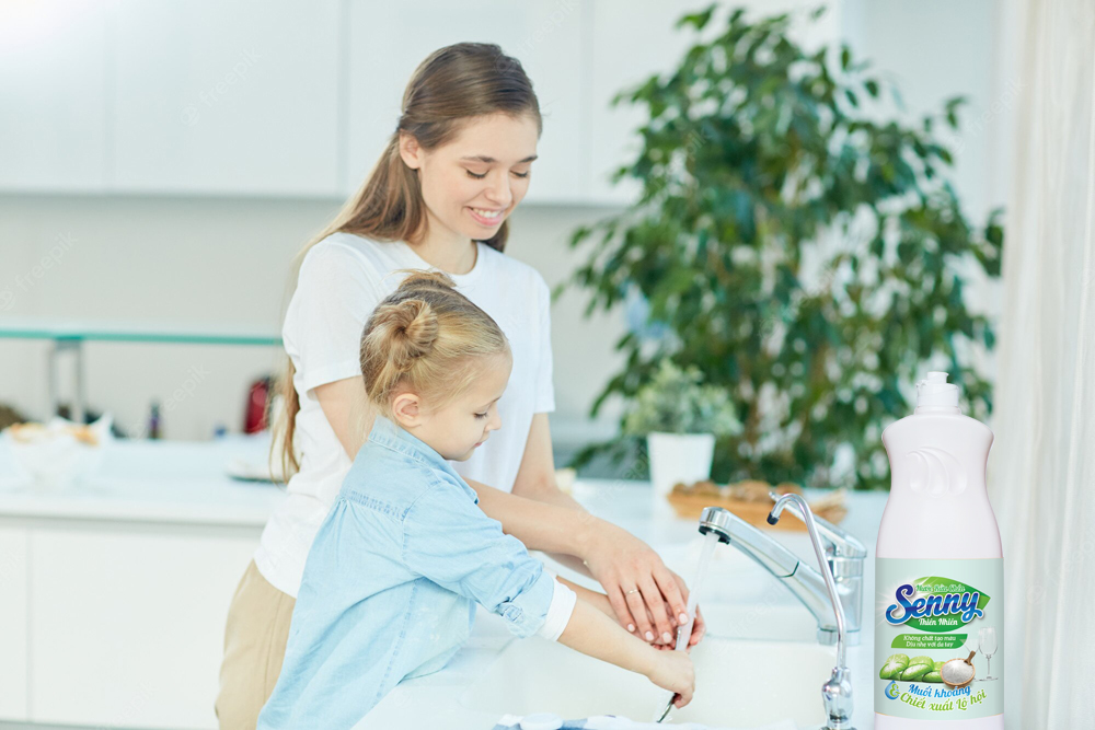 Rửa bát sạch bằng nước rửa chén an toàn và tráng lại bằng nước nóng: Sau khi bé ăn xong, mẹ cần rửa chén đĩa của bé thật sạch sẽ. Mẹ nên lựa chọn những nước rửa chén hữu cơ có nguồn gốc tự nhiên để bảo vệ sự an toàn cho bé. Những sản phẩm này không có hóa chất, nguồn gốc từ thực vật giúp mẹ hoàn toàn an tâm khi vệ sinh bát cho con và cả gia đình. Nếu cẩn thận hơn, khi rửa xong chén đĩa, hãy tráng qua nước nóng một lần, rồi sau đó úp cho chén đĩa khô ráo là được. Trước khi sử dụng, mẹ có thể lấy và dùng luôn. Bên cạnh đó, Nước rửa chén Senny hương giúp giữ ẩm và duy trì một làn da mịn màng giúp mẹ sẽ không còn lo ngại vấn đề da tay bị khô sau khi rửa chén nữa.