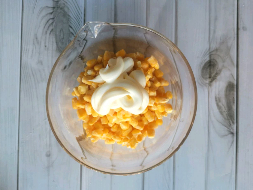 Cho ngô ngọt vào bát, thêm lượng sốt mayonnaise thích hợp vào trộn đều.