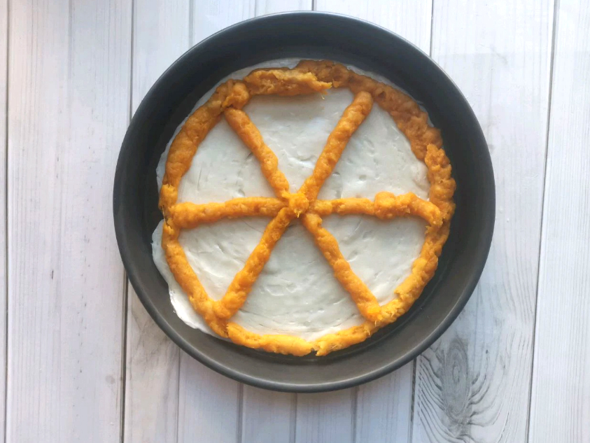 Cho đế bánh pizza vào khuôn, bóp khoai lang nghiền vào.