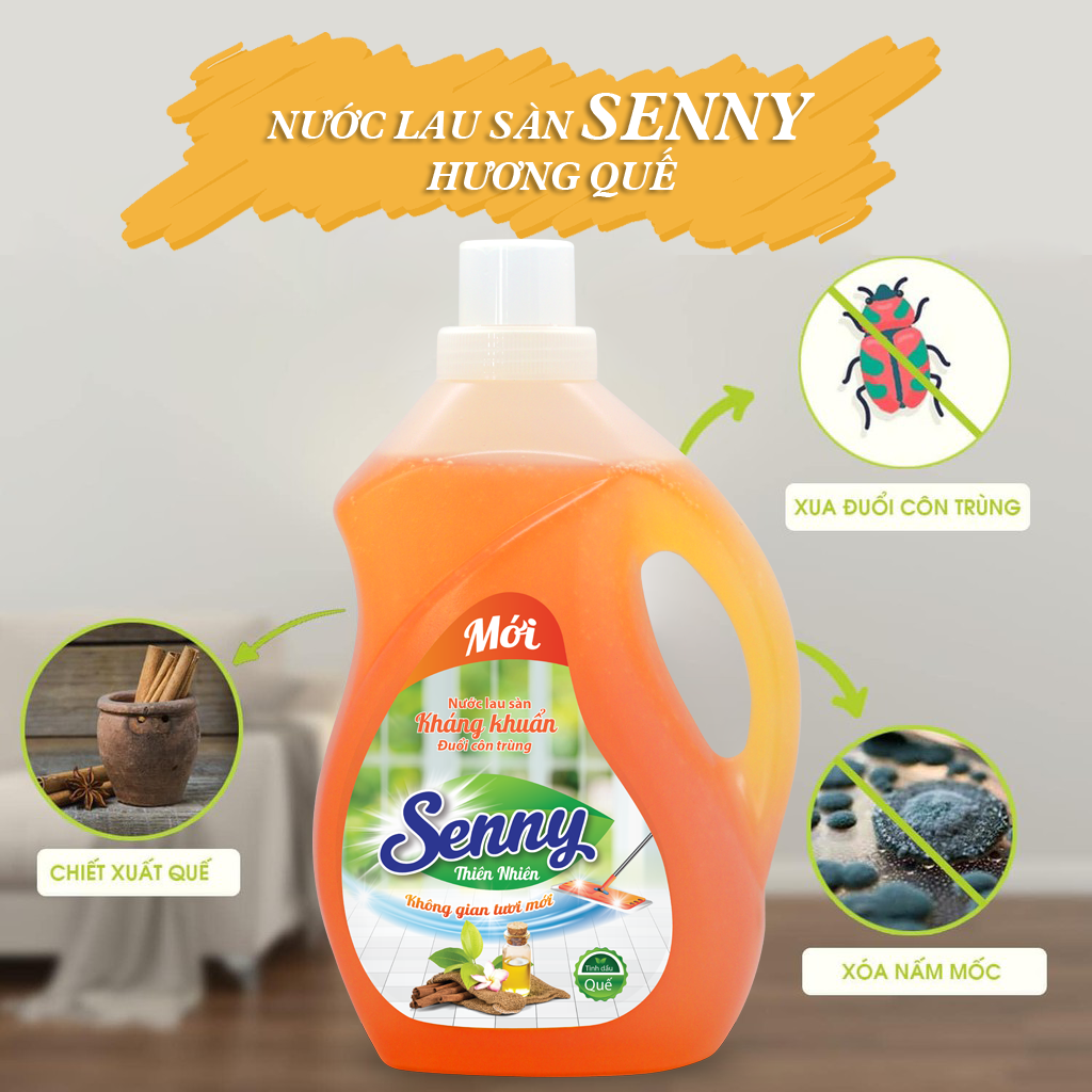 Nước lau sàn Senny hương quế với công thức hoàn toàn mới, giúp làm sạch bóng sàn nhà, đánh sạch vết bẩn và bụi bám ở mọi ngóc ngách, diệt vi khuẩn hữu hiệu, bảo vệ sức khỏe cho cả gia đình. Không chỉ có công dụng làm sạch sàn nhà, đánh tan mọi vết bẩn, nước lau sàn Senny hương quế chiết xuất tinh dầu quế sẽ tạo bầu không khí dễ chịu, thơm mát cho không gian sống, đặc biệt xua đuổi muỗi, kiến, gián và các loại côn trùng khác một cách hiệu quả.