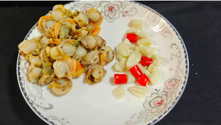 Bước 3: Thịt sò điệp đông lạnh bạn xả nước cho rã đông hoàn toàn. Sau đó rửa sạch rồi cho vào nồi nước lạnh, thêm chút rượu nấu ăn, đun sôi, chần trên lửa lớn trong 1 phút, vớt ra và để ráo nước. Tiếp theo bạn đập dập và băm nhỏ tỏi. Ớt xắt miếng nhỏ để tăng hương vị và phối màu cho món ăn.