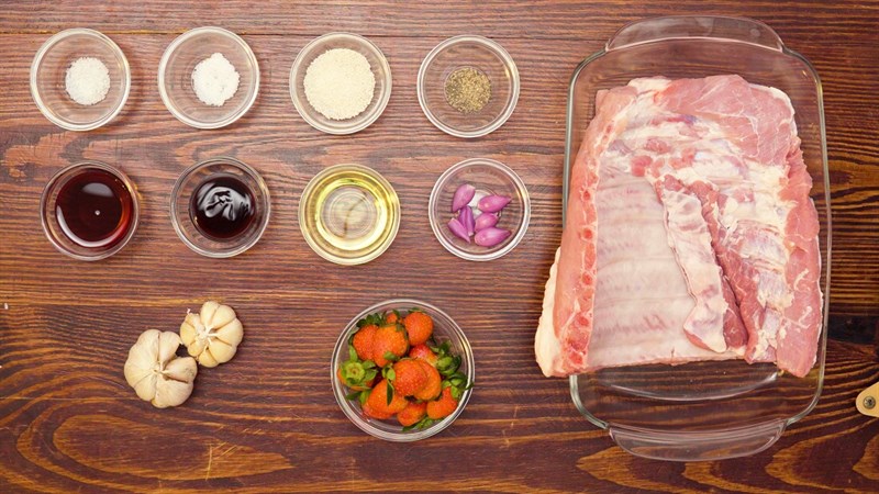 Bạn cần chuẩn bị 400gr sườn heo; tỏi băm; gia vị: 30ml nước tương, 30ml rượu nấu ăn, 15ml dầu hào, bột nêm, bột tiêu đen...