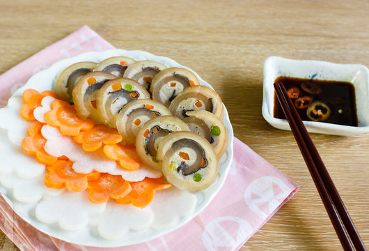 Khi ăn cắt bỏ sợi chỉ buộc và cắt khoanh mỏng ăn kèm nước tương và dưa góp.