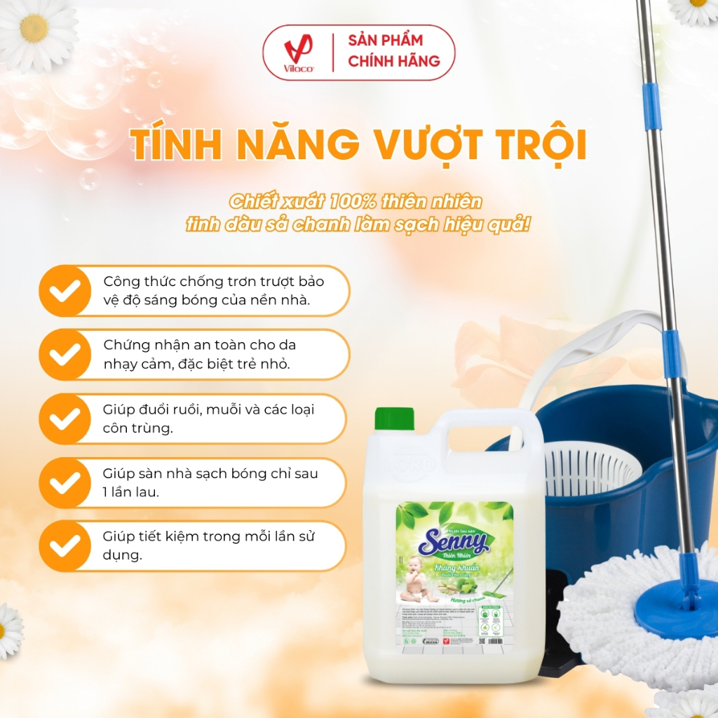 Senny Sả Chanh được sản xuất với công thức làm sạch hiện đại kết hợp tinh dầu sả chanh nguyên chất, giúp loại bỏ bụi bẩn, vết bám và vi khuẩn nhanh chóng mà vẫn dịu nhẹ với bề mặt sàn. Sàn nhà sau khi lau không hề nhờn dính, để lại cảm giác sạch bóng, khô nhanh và an toàn cho cả gia đình.