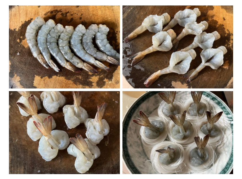 Bước quan trọng để làm cho tôm "nở" là đây: Đặt tôm nằm phẳng, dùng dao rạch dọc sống lưng, tạo một lỗ lớn xuyên bụng tôm, đảm bảo đuôi tôm có thể lọt qua lỗ. Loại bỏ chỉ đen của tôm. Sau đó luồn đuôi tôm qua lỗ và mở nó ra. và nhẹ nhàng kéo ra. Tôm sẽ lập tức "đứng thẳng" lên, giống như một nụ hoa sắp nở. Xếp từng con tôm đã "nở" lên từng phầm miến đã tạo thành vòng tròn, đuôi hướng ra ngoài, trông thật giống một bông hoa đang nở.