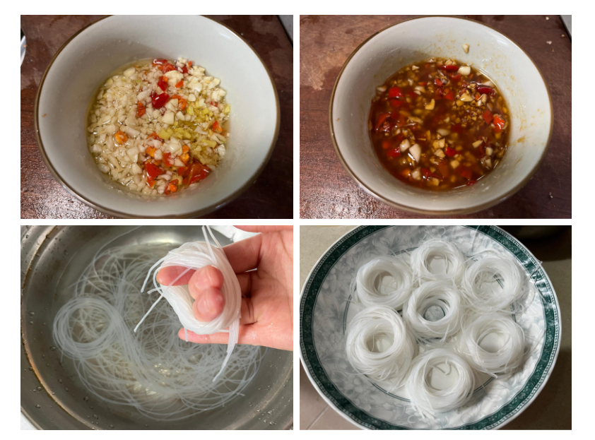 Bước 1: Bóc vỏ tỏi sau đó băm nhỏ cùng với ớt bằng dụng cụ xay tỏi (nếu không có dụng cụ ép tỏi, bạn có thể băm bằng dao, tỏi băm nhỏ sẽ giúp hương vị thơm ngon hơn). Cho tỏi băm vào bát, đun nóng 1 thìa canh dầu ăn (khoảng 70% độ nóng, bắt đầu bốc khói nhẹ) rồi đổ vào tỏi băm cho đến khi nghe thấy tiếng xèo xèo. Khi dầu còn nóng, cho thêm nước tương, dầu hào, muối vừa ăn và đường. Đường là thành phần quan trọng giúp tăng hương vị, vì vậy đừng bỏ qua bước này. Lấy một đĩa sâu lòng và xếp miến đã ngâm thành vòng tròn ở đáy đĩa, giống như tổ chim.