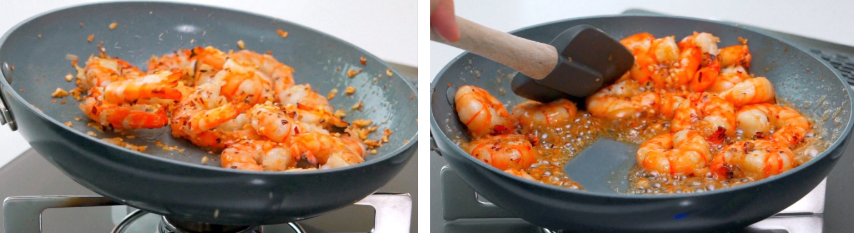 Bước 4: Lật mặt tôm và cho ớt đỏ nghiền vào. Sau đó, thêm nước sốt vào và vặn lửa lớn để nước sốt nhanh chóng sệt lại.