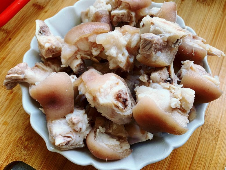 Đầu tiên, rửa sạch móng giò với nước, sau đó chặt thành từng miếng vừa ăn. Hoặc bạn có thể nhờ người bán chặt sẵn móng giò rồi về rửa sạch lại sau.