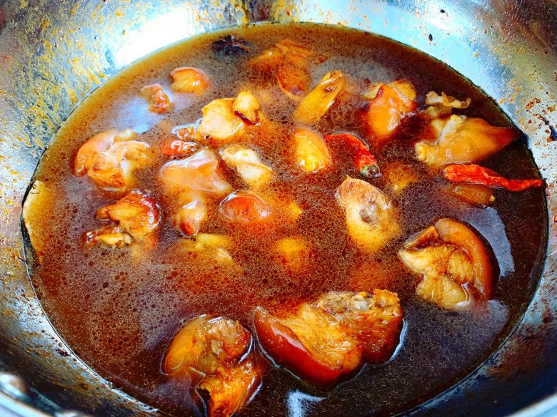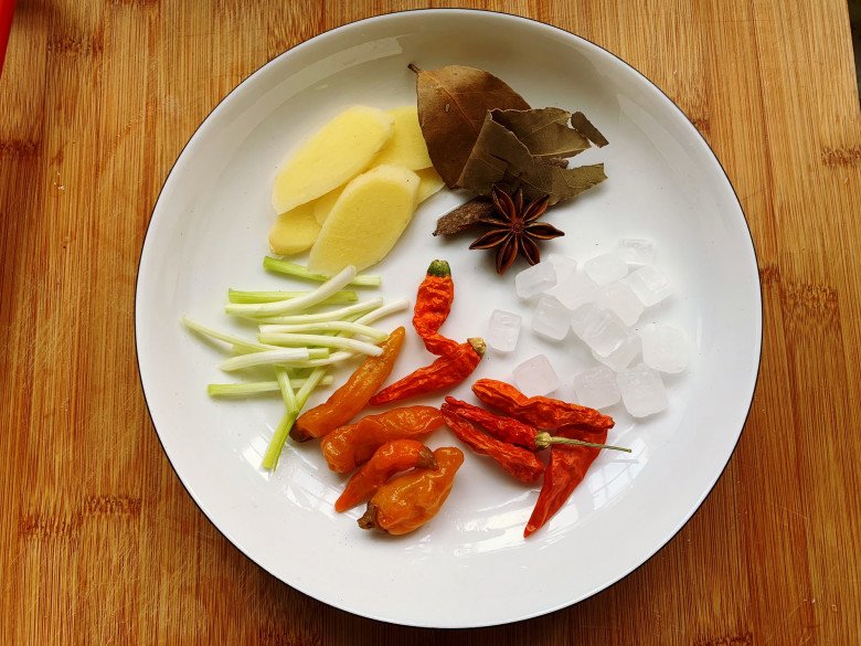 Lúc này, cho gừng, đầu trắn g hành lá, ớt khô, hoa hồi, lá nguyệt quế và quế vào xào vài lần cho thơm.