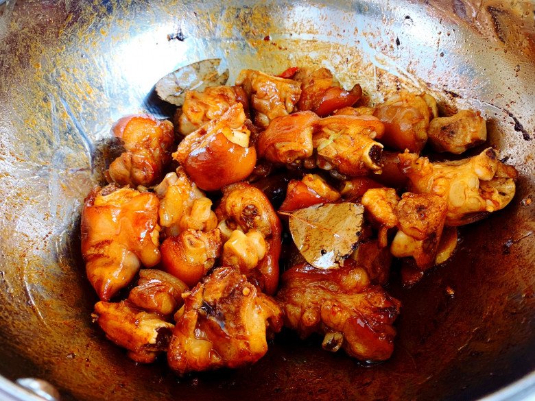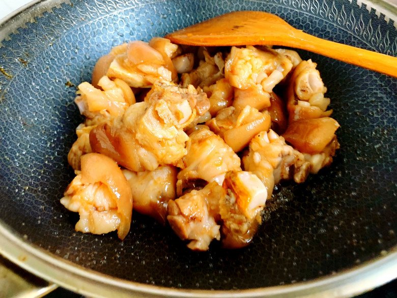 Sau khi đường chuyển thành màu vàng nâu thì cho móng giò vào xào nhanh tay.