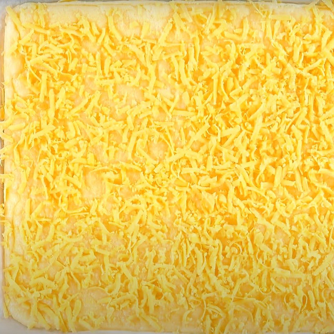 Sau khi lấy khay trứng - bí ngòi trong lò nướng ra, chị em hãy rắc 200gr phô mai Cheddar bào sợi lên mặt trứng.