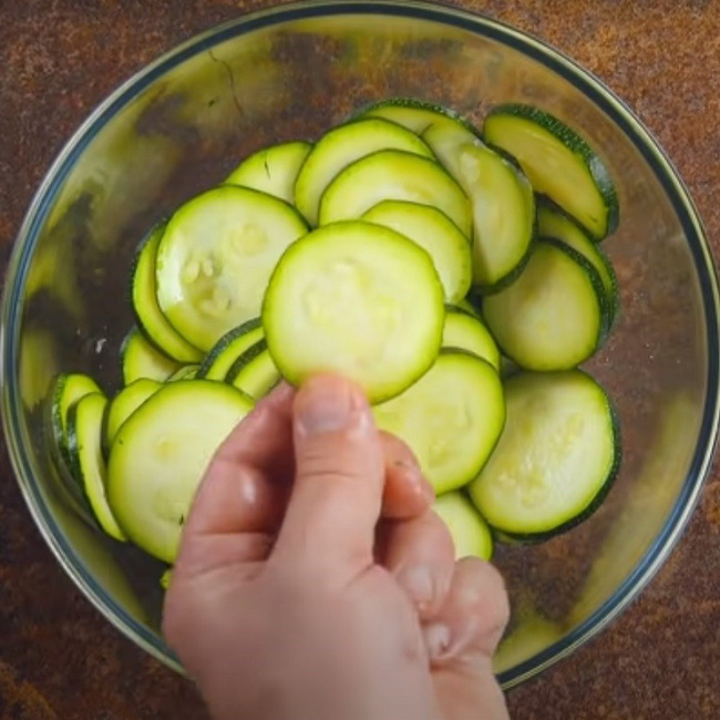 Bạn rửa sạch 2 quả bí ngòi, để ráo. Cắt bỏ phần cuống rồi thái bí thành những khoanh tròn mỏng.