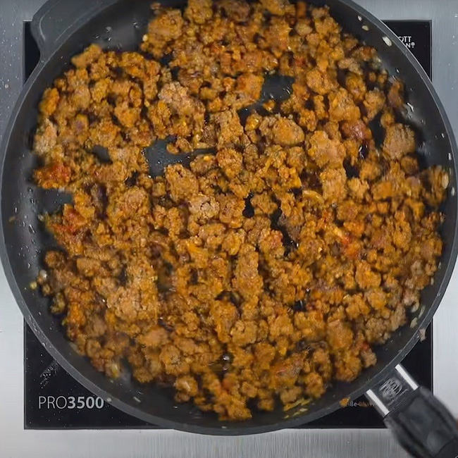 Khi hành tỏi dậy mùi thơm, cho 400-500gr thịt bò xay vào chảo cùng 1 muỗng cà phê muối, 2 muỗng canh tương cà chua, 2 muỗng canh sốt cà chua, 1/2 muỗng cà phê tiêu xay. Hạ lửa nhỏ và đảo đều tay khoảng 10 phút.