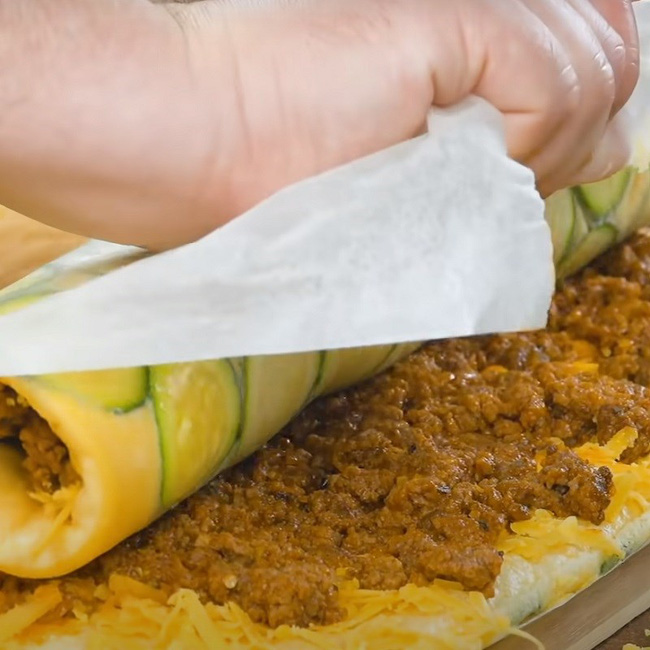 Trứng cuộn làm theo cách này không chỉ có hương vị mới lạ nhờ phô mai, bí ngòi và thịt bò mà còn có giao diện đẹp mắt, trông chẳng khác nào một cuộn bánh bông lan. Đảm bảo nhìn là muốn "chén" liền!
