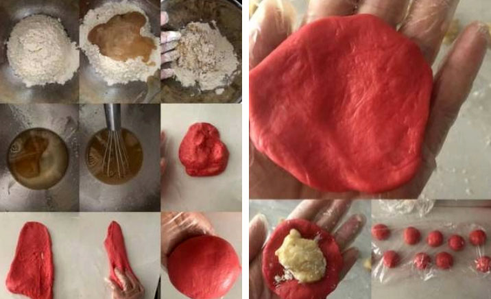 Cho mỡ heo và bột mì vào bát, thêm chút nước ấm vào khuấy nhanh. Thêm phẩm màu tự nhiên màu đỏ vào, dùng tay nhào bột thành một khối mịn. Cũng dùng màng bọc thực phẩm bọc lại để nghỉ như khối bột màu trắng.