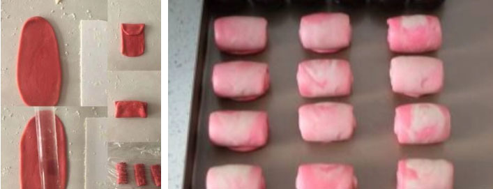Sau khoảng 45 phút, chia đều bột thành 12 phần nhỏ (nếu lượng bột nhiều hơn thì chia nhiều hơn). Mỗi phần nhân trắng được bọc bên ngoài bằng phần bột hồng hoa đào. Dùng cây lăn bột cán mỏng phần bột vừa thực hiện thành dải hình chữ nhật. Gấp tròn các dải lại. Lặp lại như vậy khoảng 3-4 lần hoặc nhiều hơn, phụ thuộc vào mức độ giòn bạn muốn.