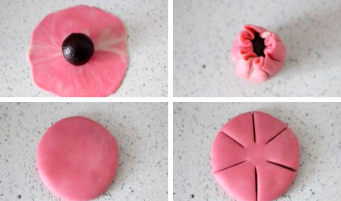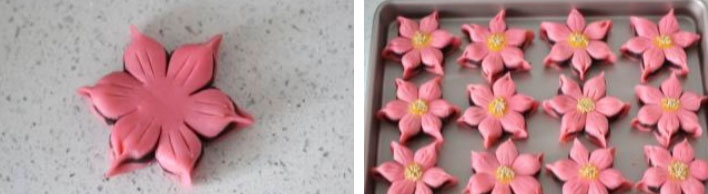 Chia phần nhân đã chuẩn bị trước thành các phần nhỏ, mỗi phần khoảng 30g. Phần bột vừa để nghỉ cán mỏng, bọc lấy nhân và vo tròn. Ấn dẹt xuống và dùng kéo cắt rời thành các bông hoa 5 cánh hoặc 6 cánh.