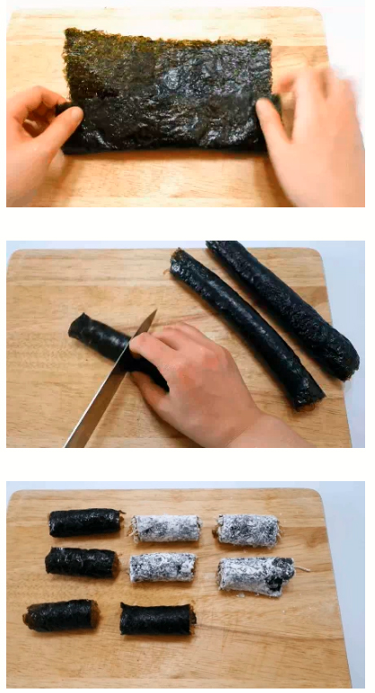 - Trải lá rong biển ra thớt, cho 1 lượng miến vừa đủ vào và cuộn lại. Thấm ướt mép của lá rong biển để dính chắc cuộn miến.