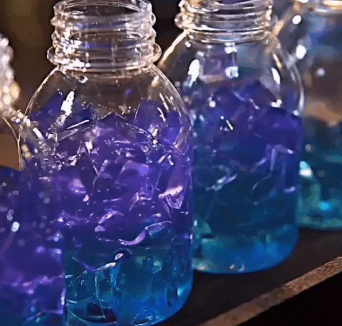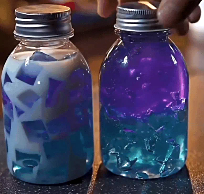 Sau khi thạch hoa đậu biếc đã đông, bạn cắt nhỏ, cho vào lọ hoặc cốc. Đổ sữa lên và thưởng thức.
