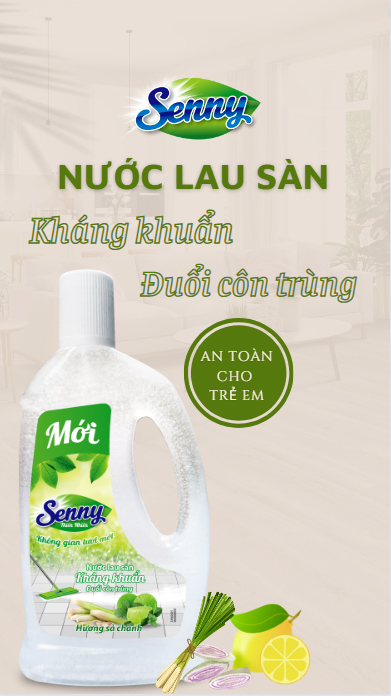 Nếu bạn đang lo lắng khi sàn nhà mình dù đã lau chùi thường xuyên mà vẫn không sạch. Vết bẩn, côn trùng, mùi ẩm mốc vẫn tồn tại. Bạn băn khoăn tìm kiếm một loại nước lau sàn an toàn cho làn da, hệ hô hấp. Đặc biệt là trẻ nhỏ có thể thoải mái vui chơi không lo dị ứng. Nước lau sàn sả chanh Senny của công ty CP Vilaco là sự lựa chọn hoàn hảo. Với công thức thiên nhiên cải tiến giúp nhà sạch mát, xua đuổi côn trùng hiệu quả. An toàn cho sức khỏe cả gia đình.