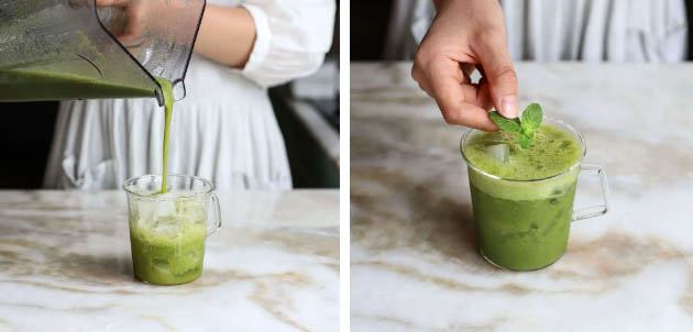 Bước 4: Khi hỗn hợp sinh tố đã đồng nhất, mịn đều thì bạn rót ra ly và thêm bạc hà là hoàn thành.