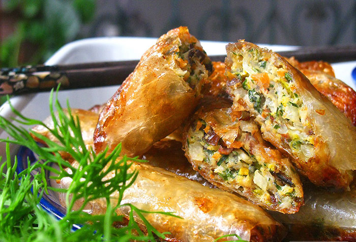 - Khi nem đã vàng đều, bạn vớt ra một dĩa có giấy thấm dầu. Sau đó trang trí với rau thơm và thưởng thức khi còn nóng.