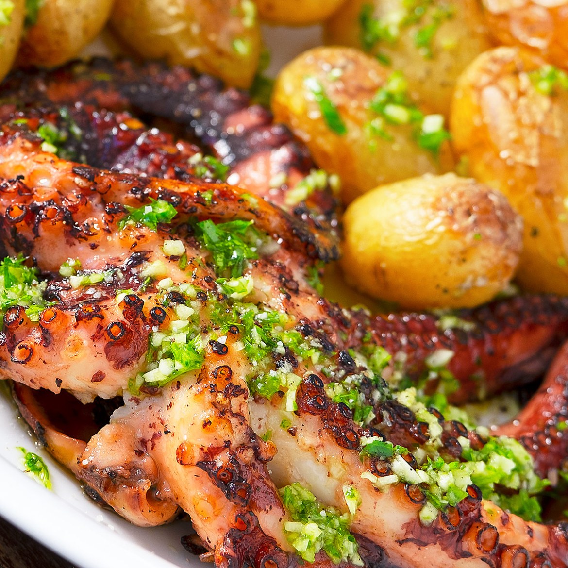 Món bạch tuộc nướng này hơi độc đáo một chút, đó là sẽ làm chín mềm bạch tuộc trước khi nướng. Sau đó, đem nướng vàng xém trên than hoa rồi rưới nước sốt tỏi, mùi tây lên trên.