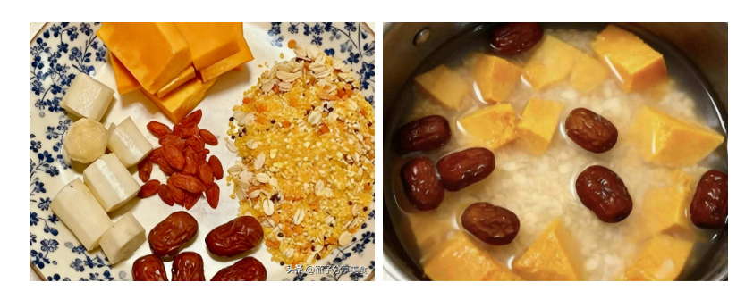 Cháo ngũ cốc bí đỏ và củ mài với hương vị mềm, ngọt và các dưỡng chất tự nhiên có thể xua tan cái lạnh và làm dịu dạ dày mệt mỏi, là món quà hoàn hảo cho sức khỏe của phụ nữ trung niên và cao tuổi trong mùa đông này. Món ăn này vừa ngon, lại bổ dưỡng, ấm bụng, tốt cho sức khỏe, mà công thức cực kỳ đơn giản. Cả người lớn lẫn trẻ nhỏ đều sẽ tranh nhau thưởng thức cho mà xem. Bí đỏ có tính vị ngọt, tính ôn, đi vào kinh tỳ và vị, giúp kiện tỳ, ích khí, điều hòa chức năng tiêu hóa. Đây là thực phẩm hữu ích cho các trường hợp tỳ vị hư nhược, ăn uống kém, đầy trướng bụng, mệt mỏi và giúp phòng ngừa táo bón do giàu chất xơ. Củ mài rất giàu chất nhầy và tinh bột, có thể thúc đẩy quá trình tiêu hóa và hấp thu ở đường tiêu hóa, đối với người bị khó chịu đường tiêu hóa và tỳ hư có tác dụng điều hòa rất tốt.